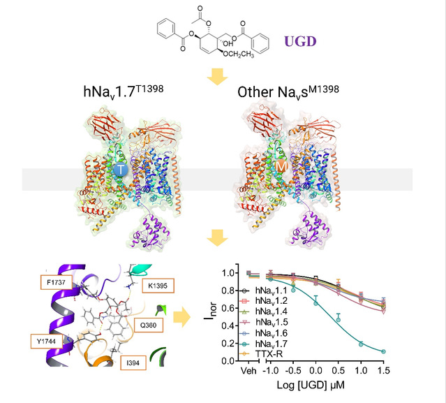 电压门控钠通道Nav1.7是痛觉传导过程中的关键分子,主要表达于外周感觉神经元,能够放大低阈值电流并促进动作电位的产生。正因其在疼痛感知中的核心地位,Nav1.7长期被视为开发非成瘾性镇痛药物的理想靶标。然而,由于各钠通道亚型之间结构高度同源,实现高选择性抑制一直面临巨大技术挑战。既往虽报道多种Nav1.7抑制剂,但或因疗效不足,或因安全性问题,均未成功进入临床阶段。通过对天然产物库进行高通量筛选,研究人员从植物Uvaria grandiflora中分离出多氧取代环己烯类化合物,并确定Uvarigranol D(UGD)可显著抑制电压门控钠通道激动剂Antillatoxin诱导的人Nav1.7介导的膜去极化。进一步研究发现,UGD几乎完全抑制Nav1.7,而对Nav1.1、Nav1.2等亚型作用较弱,表现出明显选择性。嵌合通道实验证实,Nav1.7中特有的Thr1398位点对UGD的高效抑制至关重要,该位点突变后抑制效能显著下降。