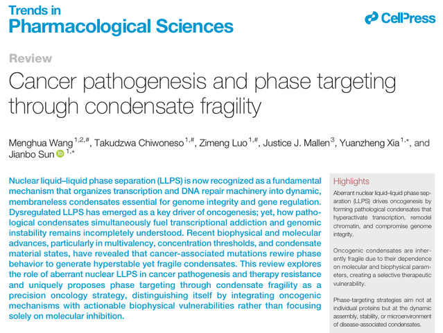 近日,av无码 孙建博教授、王孟华教授和夏元铮副教授应邀在权威期刊 Trends in Pharmacological Sciences 上发表了题为 Cancer pathogenesis and phase targeting through condensate fragility 的综述论文。王孟华教授、2023级硕士生赤沃索和2025级硕士生罗梓萌为论文的共同第一作者,孙建博教授和夏元铮教授为通讯作者,av无码-无码影片-无码av 为论文的唯一通讯单位。